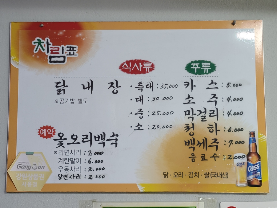 메뉴는 닭내장탕, 옻오리백숙 두가지만 있어요