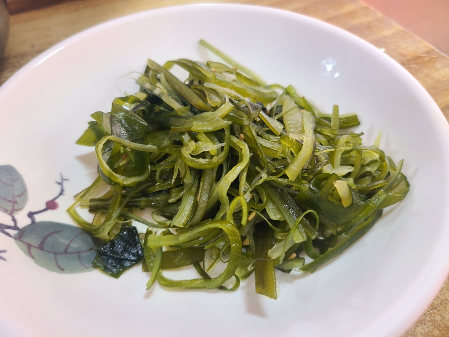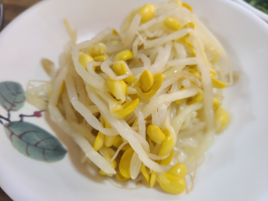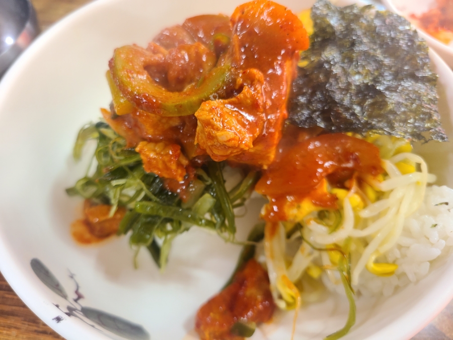 미역줄기, 콩나물, 배추김치, 단무지, 계란후라이, 김