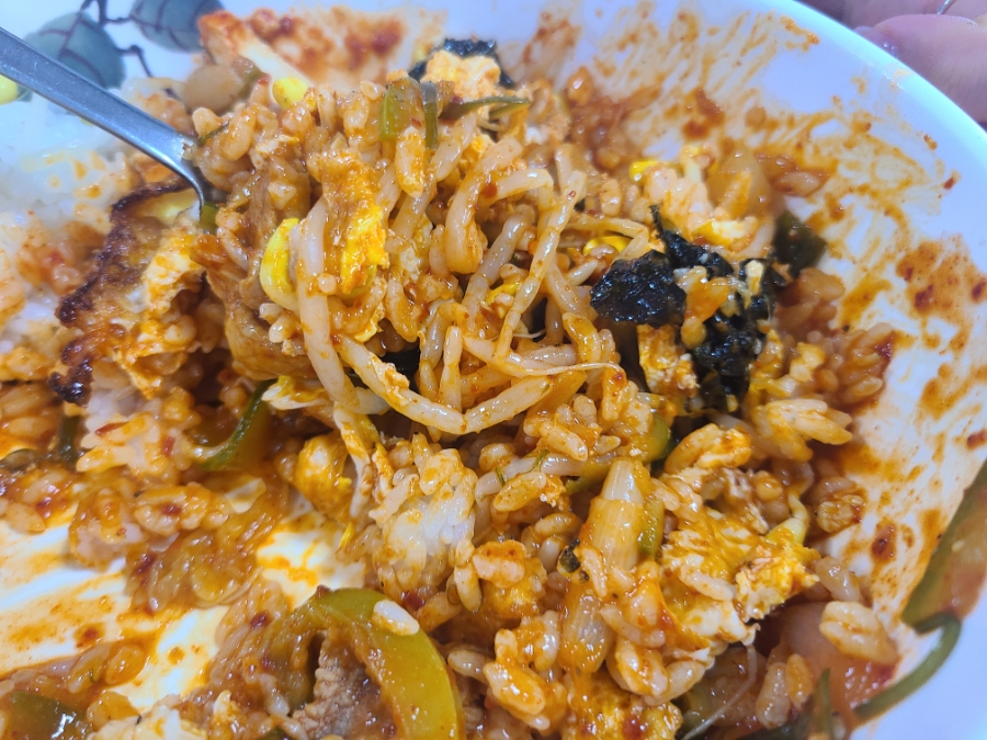 단무지를 제외한 모든 반찬과 찌개를 넣고 슥슥 비볐어요