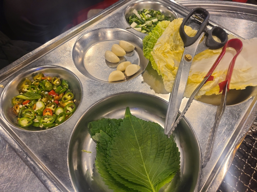식판에 쌈종류가 나와요. 불판 쪽은 뜨거울 수 있으니, 잡을 때 조심하세요