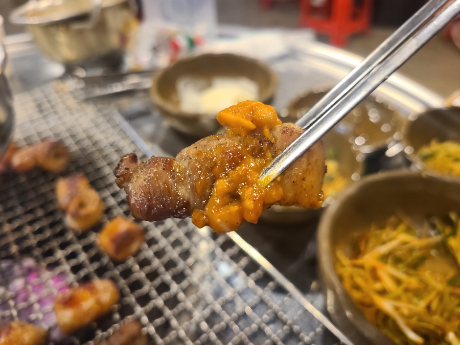 삼겹살은 쌈장에 듬뿍 찍어줍니다.