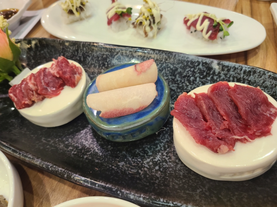 엑기스, 갈비찜, 마까스, 사시미, 초밥