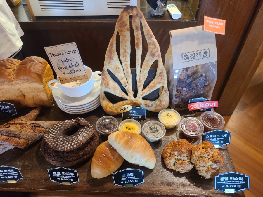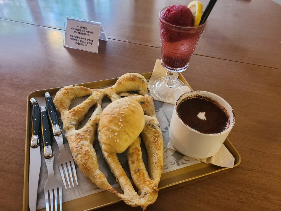 저는 핫초코와 소다, 루가스, 소금빵, 그리고 바질버터를 주문했어요