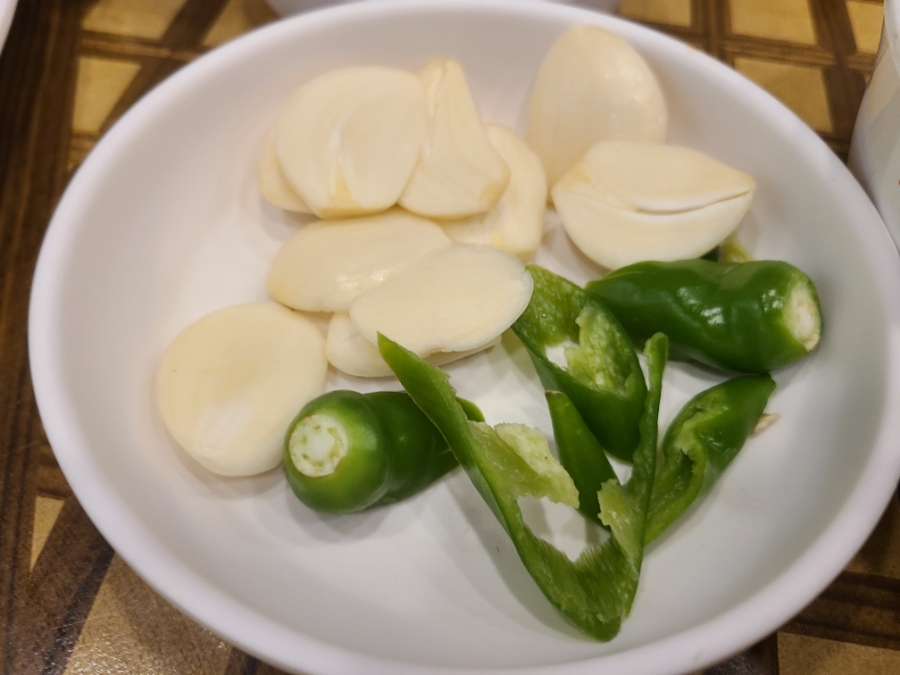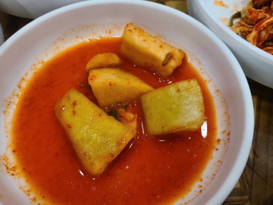 배추김치, 감자조림, 깍두기, 파저리, 오이김치, 쌈, 김, 젓갈, 동치미, 멸치볶음, 마늘, 고추, 기름장, 쌈장