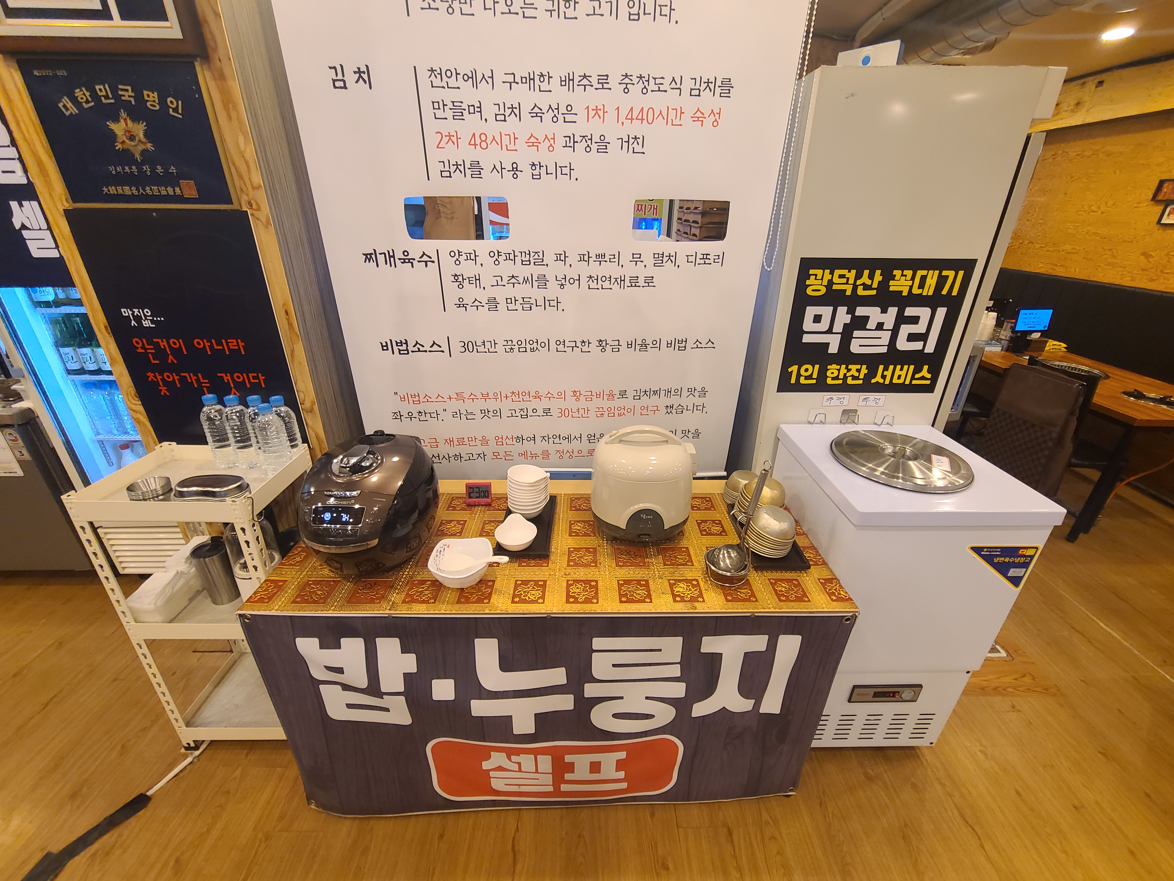 셀프코너 옆에는 밥, 누룽지, 그리고 광덕산 꼭대기 막걸리도 있어요