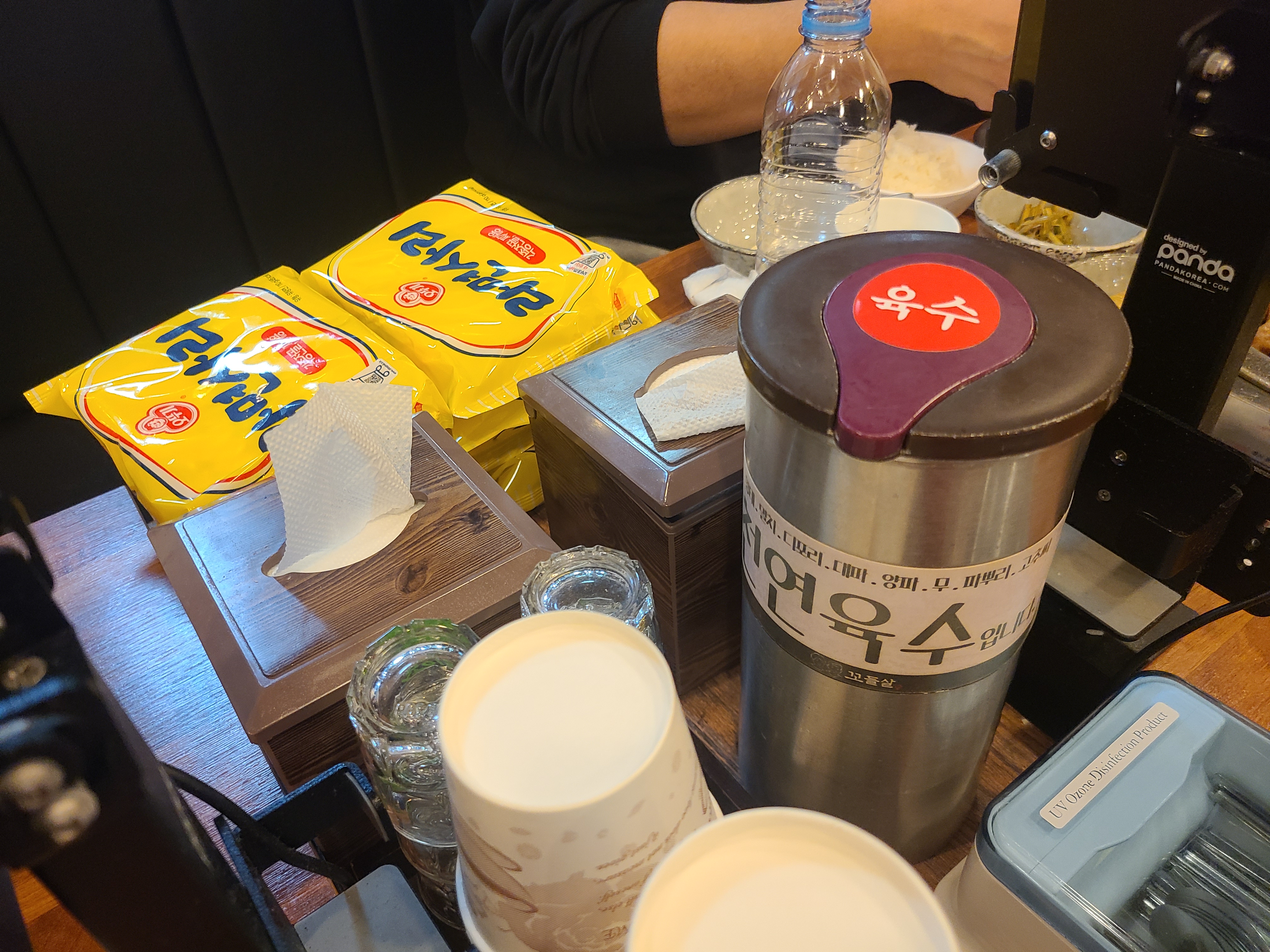 김치찌개에 넣을 무한 라면사리와 천연 육수가 테이블마다 구비되어 있어요