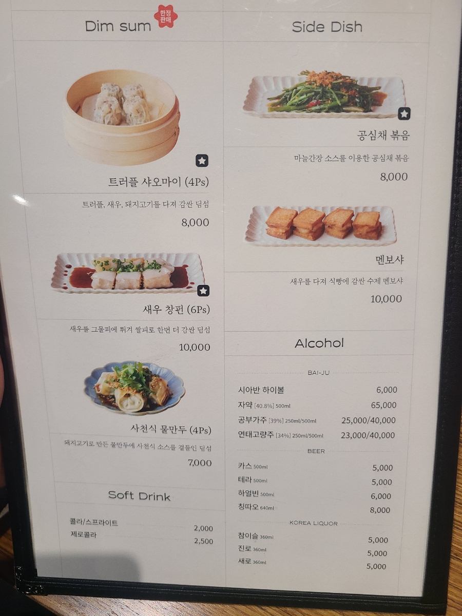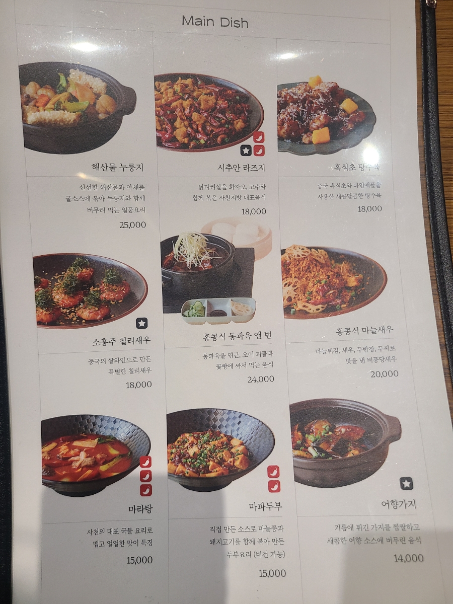 해산물 누룽지, 시추안 라즈지, 흑식초 탕수육, 소홍주 칠리새우